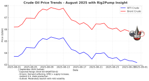 - August 2025 saw crude prices driven by a mix of supply-tightness fears, strategic OPEC+ outputs, and cooling demand trends—resulting in a mild decline from early highs (~$66) to ~$64 WTI.